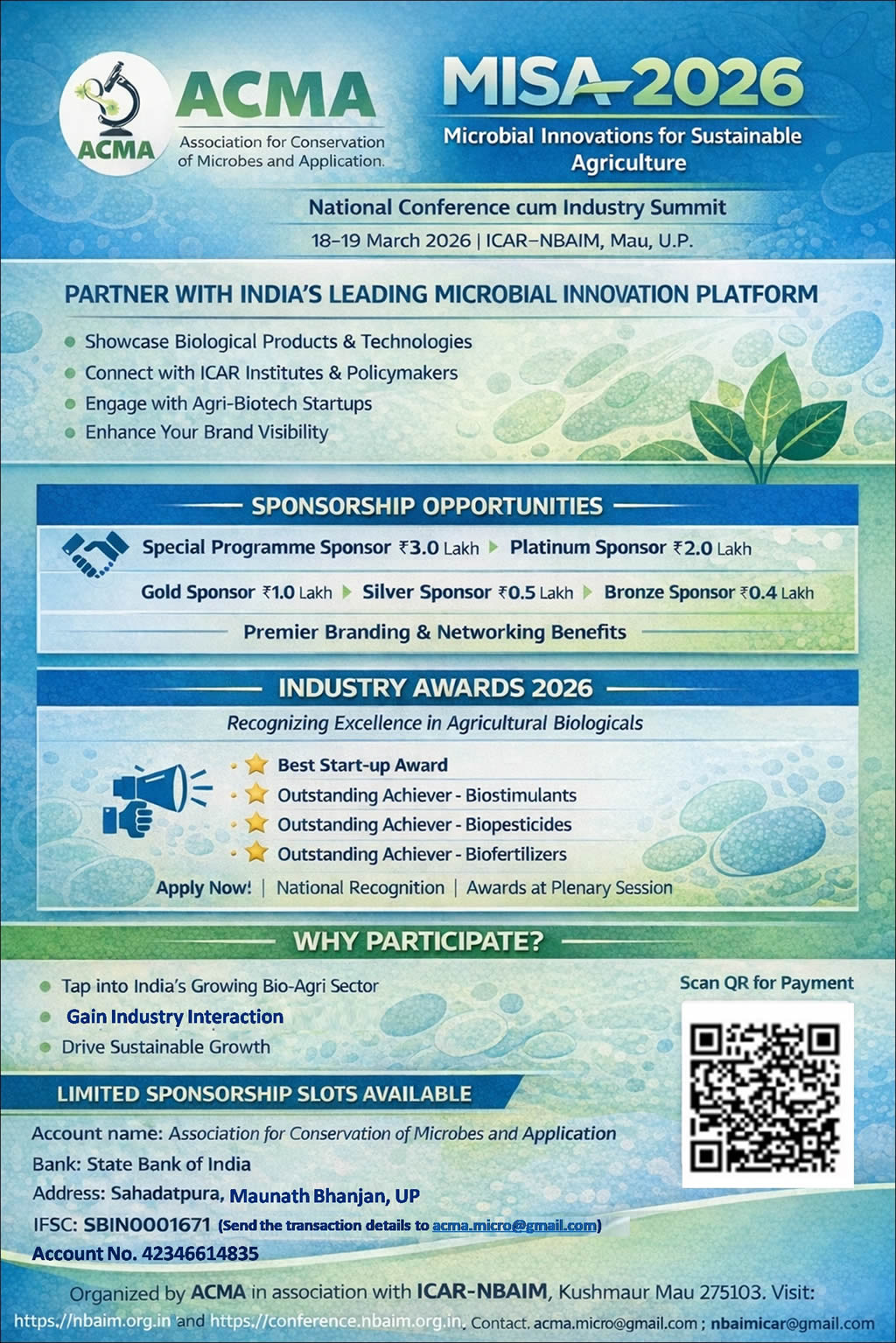 It is our great pleasure to invite subject experts, researchers, academicians, and industry representatives to the National Conference cum Industry Summit titled “Microbial Innovations for Sustainable Agriculture (MISA-2026)”, scheduled for March 18–19, 2026, at the ICAR National Bureau of Agriculturally Important Microorganisms (NBAIM), Mau, Uttar Pradesh.